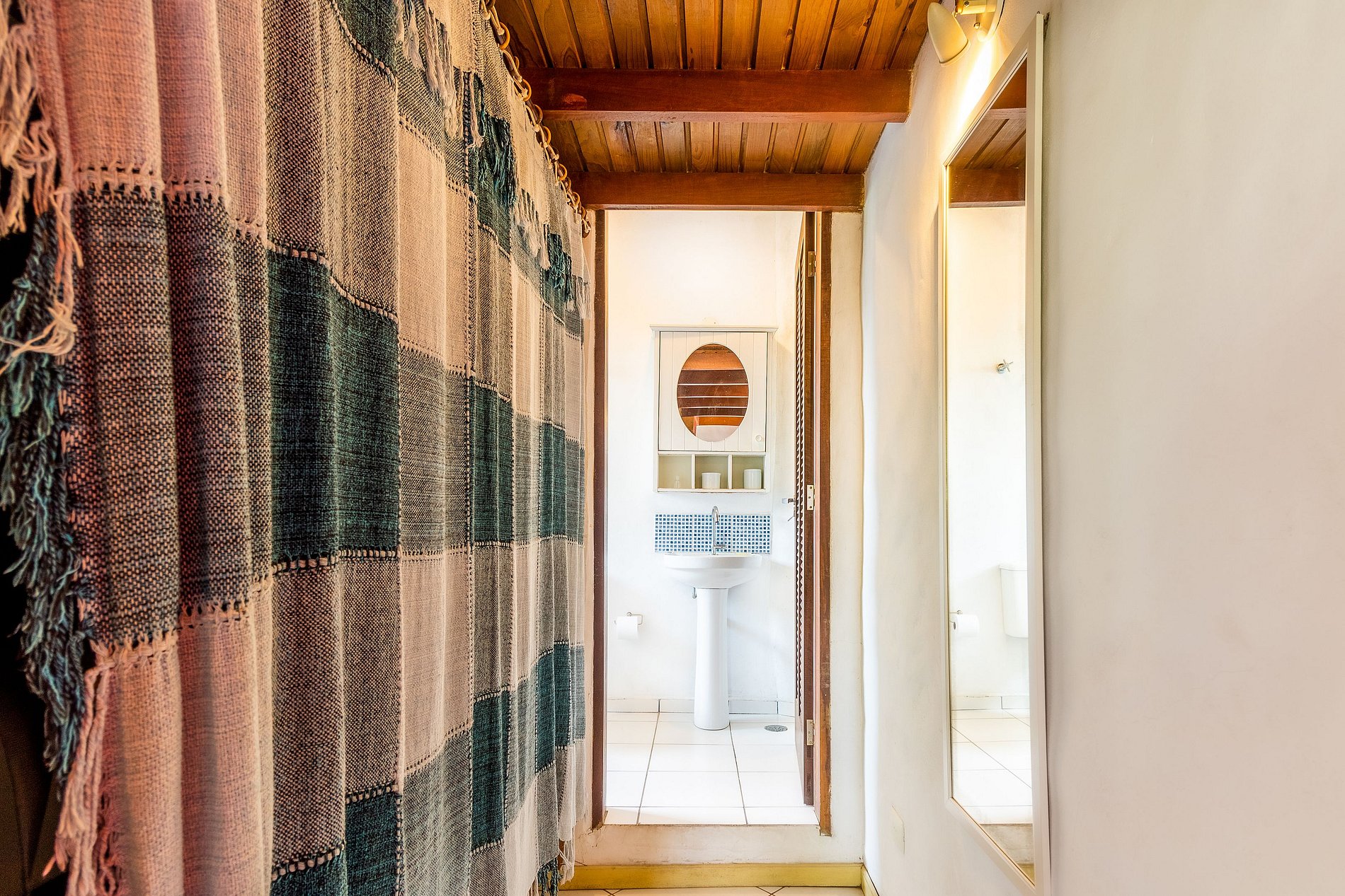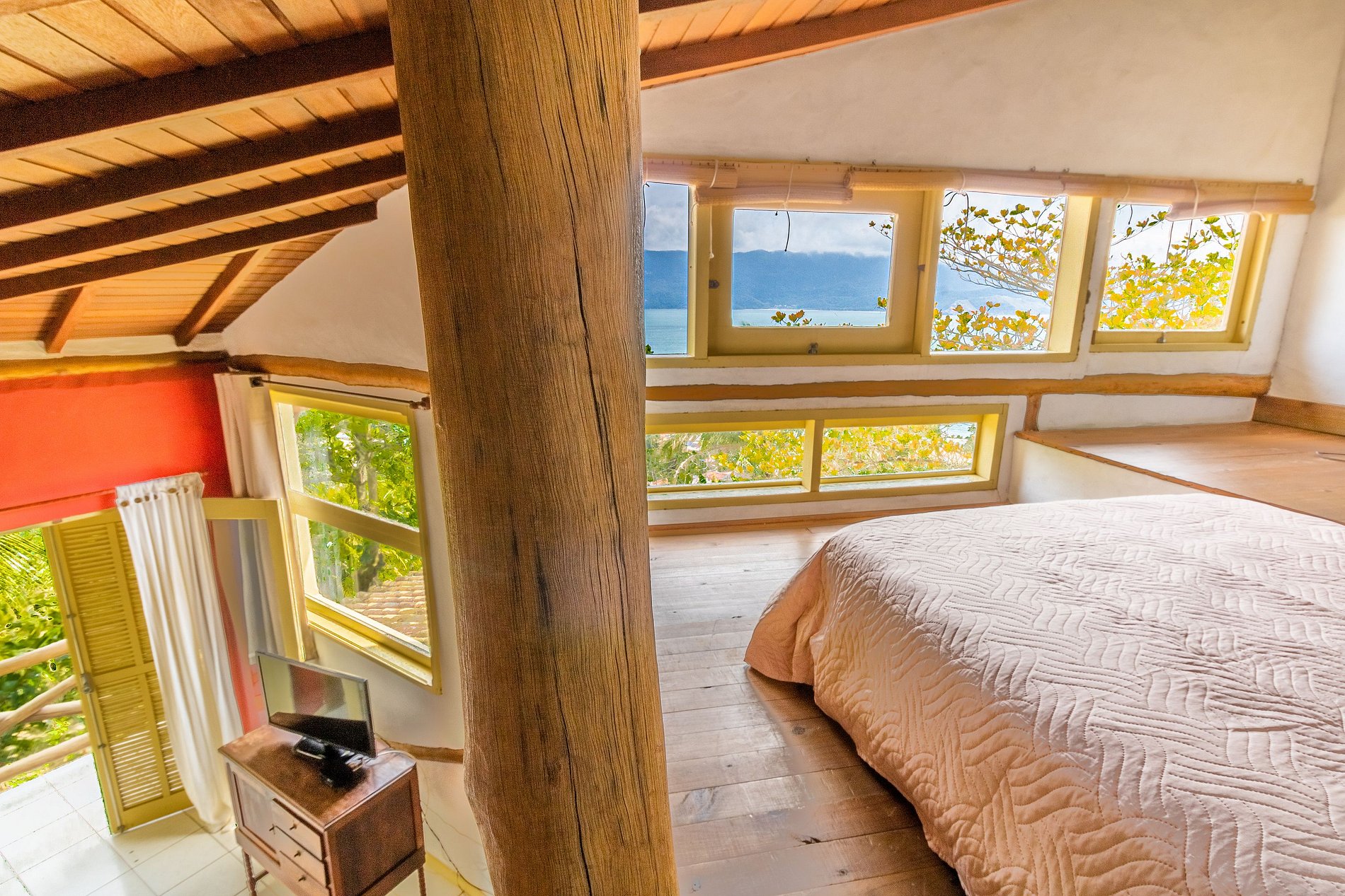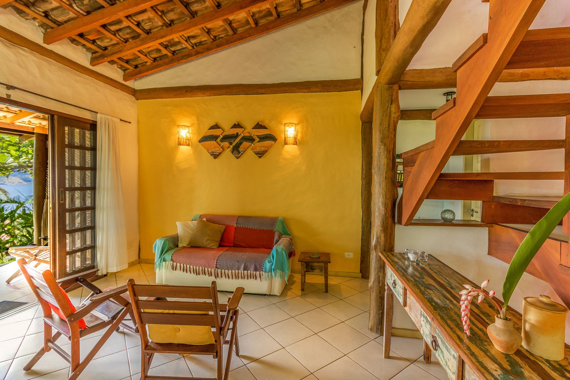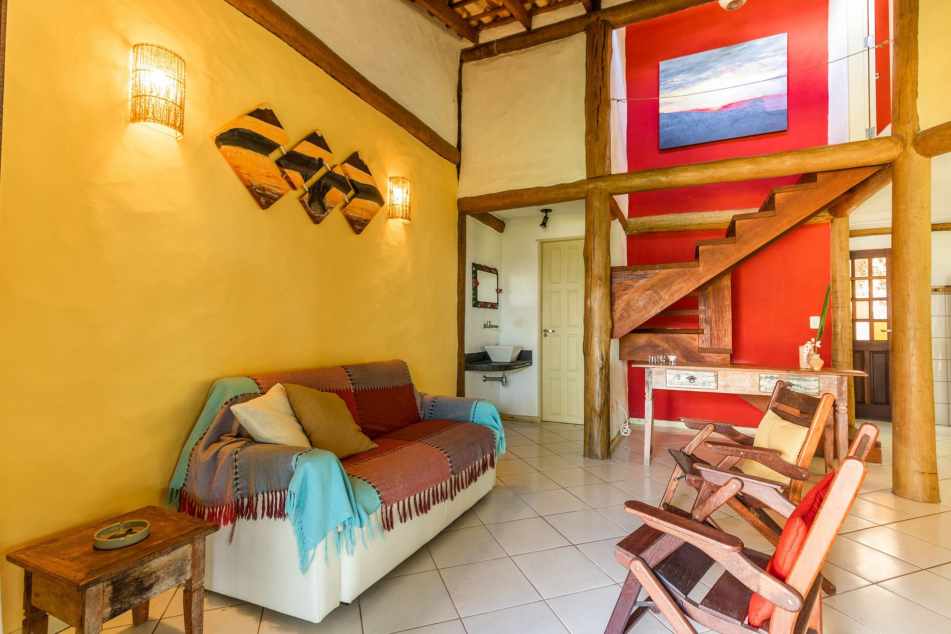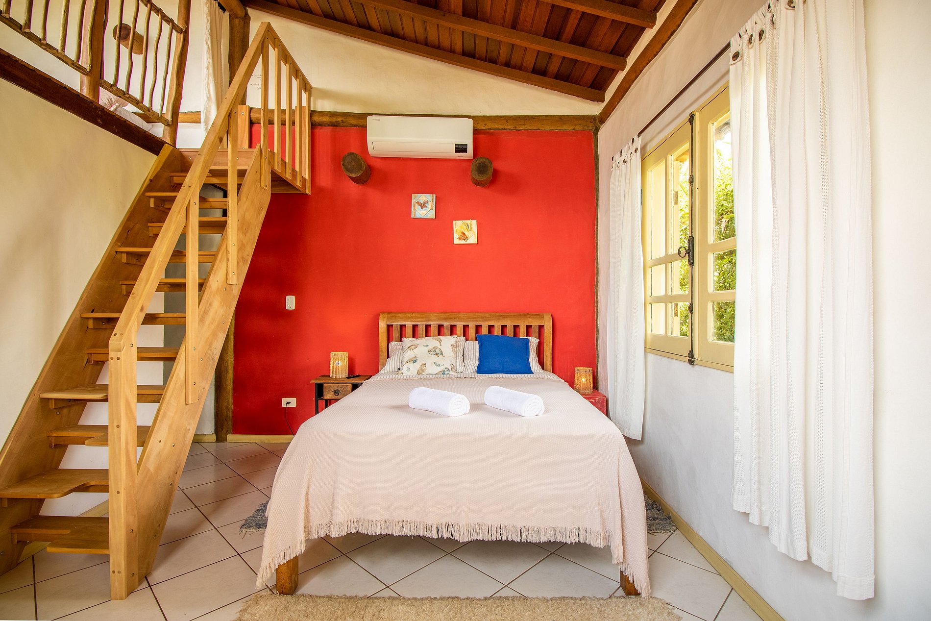 • Aconchegante mezanino com cama de casal, acessado por uma escada estilo Santos Dumont.